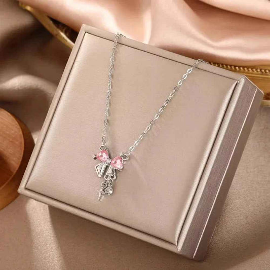 Sweet Pink Bow Necklace Ladies Fashion Sparkling Rhinestone Star