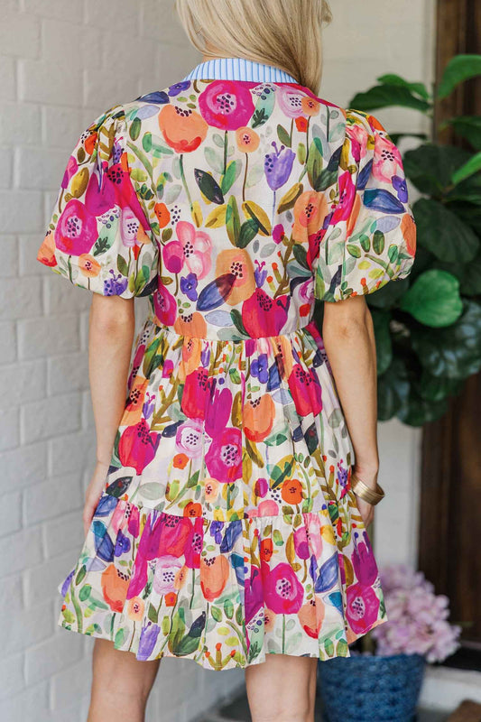 Multicolour Boho Floral Print Buttoned Long Sleeve Shirt Dress