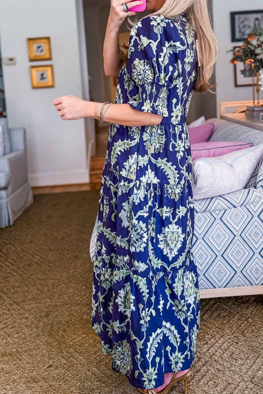 Blue Floral Print Short Puff Sleeve Ruffle Hem Belted Long Dress