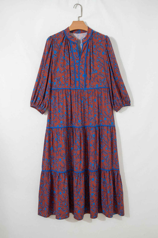 Brown 3/4 Puff Sleeve Tiered Loose Floral Dress